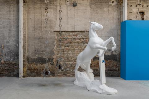 Als veraltetes Symbol männlicher Herrschaft erinnert das Pferd an andere anachronistische Überbleibsel wie Marmor- oder Bronzestatuen im öffentlichen Raum oder Porzellanschnickschnack für die Wohnung. Für ihre monumentale Pferdeskulptur verwendet die Künstlerin Styropor, ein sprödes, nicht-monumentales Material. Dunkelberg verzichtet bewusst auf die Verwendung von Metall oder Stein und verwendet stattdessen ein gängiges Modelliermaterial, das leicht und vergänglich ist. Obwohl die Haut des Pferdes aus Bronze dauerhaft und beständig sein soll, erodiert sie mit der Zeit, ebenso wie die Verwendung von Symbolen und Materialien im Laufe der Zeit abnimmt. Auch hier stellt der Künstler die Frage: Auf welche Weise werden unsere Beziehungen zu Objekten durch Zeit und Geschichte geprägt? Kann etwas abstrakt und doch identifizierbar sein? Ihre Skulpturen demontieren Kitsch und Klischees und nähern sich dem riskanten (und vergeblichen) Zustand der Idolatrie.