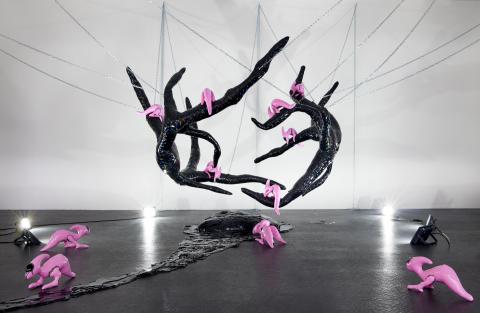 Betrachtet man die jüngsten Entwicklungen im künstlerischen Schaffen von Mary-Audrey Ramirez, so erkennt man eine Obsession für das Jenseitige. Insektoide, glänzende Oberflächen, tropfende, schleimige Essenzen, die sich gegen den sauberen weißen Raum einer Galerie absetzen. Die Fähigkeit der Künstlerin, Fantasie und reales Leben zu kontrastieren, ist ein überzeugendes Argument für ihre Arbeit. Worldbuilding ist ein integraler Bestandteil ihrer Praxis. Cosplay, Videospiele sowie die stetige Migration des Digitalen in unsere Welt nähren ihr Bestreben und triefen von ihren Werken.