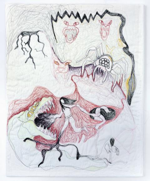 Die Künstlerin fertigt die gestickten Bilder, die manchmal als Skizzen für spätere Arbeiten dienen, mit der Nähmaschine an. Inspiriert von Spielszenen schiebt sie intuitiv ein Stück Stoff unter die Nadel der Nähmaschine, wobei das Rattern der Maschine auf sie die gleiche beruhigende Wirkung hat wie das "Schießen in alle Richtungen" bei einem Spiel. Aus anfänglichen Fadenkritzeleien erschafft sie seltsame Welten und Erzählungen, in denen Fabelwesen und hybride Gestalten gegeneinander kämpfen, Macht demonstrieren oder demütig erscheinen.