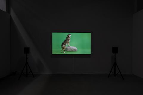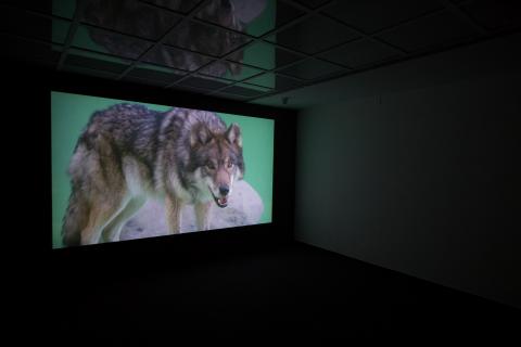 Brinker makes a wolf the protagonist of his work. In Hanover he found a wild animal trainer who works with domesticated wolves to use them on film sets and for commercials. Brinker filmed a wolf in front of a green screen. The camera follows the behaviour of the animal, which is deliberately not instructed to act. Thus, the camera's eye scans the wolf's behaviour, which remains strangely suspended between its natural behaviour and a trained one.